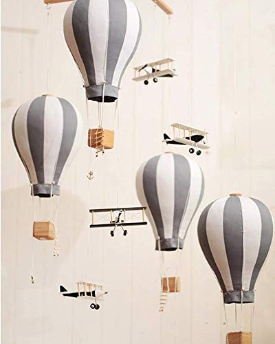 Gray-white fabric Hot Air Balloons and airplanes mobile. This is a great mobile for spacious rooms. Its a perfect addition to your nursery decor. This mobile will be great as a gift for the baby shower or birthday. Materials: fabric, sintepon, hard wood, brass. Size: H – 1100 mm (43,3″)