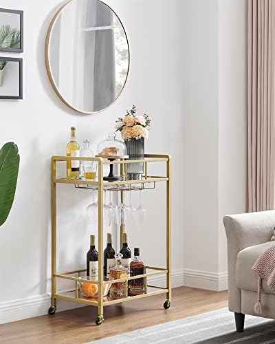 Hzuaneri Bar Cart – 2-Tier Home Bar Serving Cart with Wine Glasses Hooks, Accent Kitchen Cart with Lockable Wheels, Beverage Cart with Storage Shelf for Home, 15.7 x 23.6 x 35.4 Inches, Gold 01401GBC