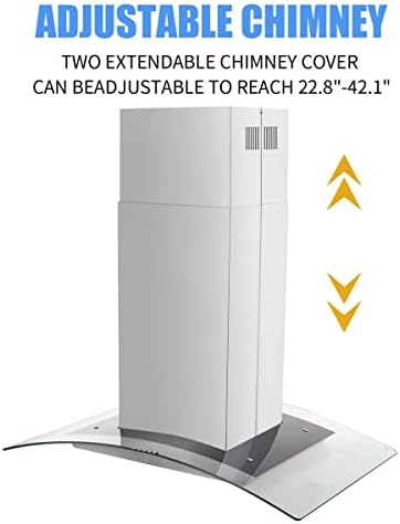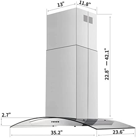 *700 CFM Powerful airflow capacity *430 Stainless steel & Curved tempered glass *Dishwasher-safe, Baffle filters to trap cooking grease and oil, easily removable *Adjustable chimney from 22.8 inch to 42.1 inch, fit 8 – 10 ft height ceiling Ultra-quiet powerful motor