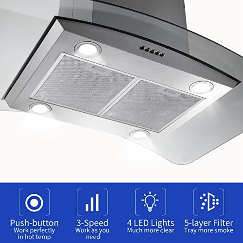 【Easy-to-Control Mechanical Button】: Range hood equipped with classic and easy-to-operate Mechanical button, which can work perfectly in diverse kitchen environment, especially in hot temp and long time use. You know how to use it even if you see it first time.