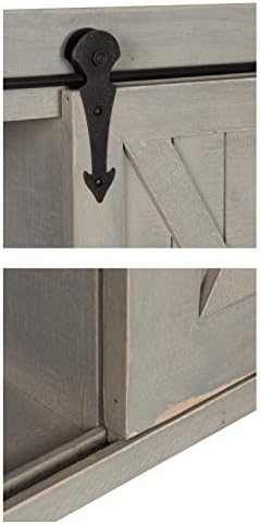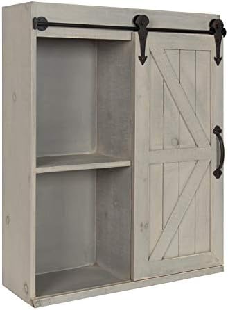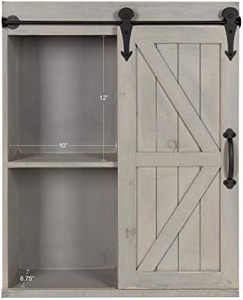 Decorate your home in vintage farmhouse style with this unique hanging wall shelf with sliding barn door. Newly designed in a smaller, one door size, this hanging cabinet will organize spaces if you only have a bit of wall space but still want smart storage. It’ll work exceptionally well in an entryway, mudroom, kitchen, bathroom, living room, or guest room. The hanging cabinet has three inner shelves on the right side and two shelves on the left side to store items of different shapes and sizes. The single barn door slides to cover either side. The three shelves on the right side are each 10 inches wide, 6.75 inches deep, and there are just under 8 inches of height between shelves. The two shelves on the left side each are 10 inches wide, 6.75 inches deep, and have 12 inches of vertical space. The outer dimensions of this wall shelving unit are 21.5 inches wide, 27.5 inches high, and 8 inches deep. Two metal Z-bracket hangers are inset on the back of the cabinet for easy secure wall display. This wall cabinet arrives completely assembled ready to use.