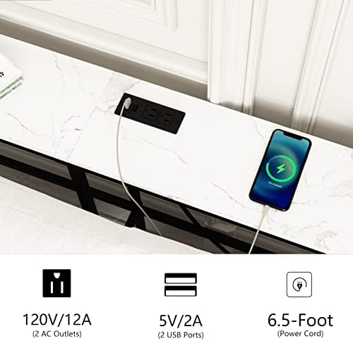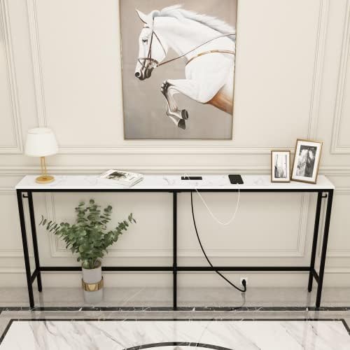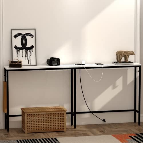 Leomonio 7.9" Narrow Sofa Table with Outlet, 70.9" Long Console Table Behind Couch, Skinny Table with Detachable Hooks and Charging Station for Entryway, Hallway and Living Room, Faux White Marble