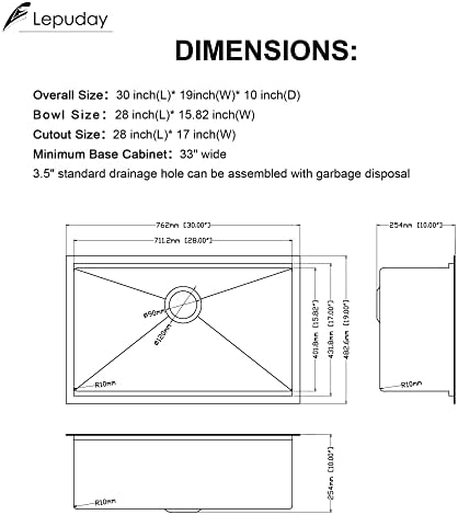 【Workstation Kitchen Sink Dimensions and package】Exterior Size:30″(L) x 19″(W) x 10″(D),–Minimum Cabinet Size: 33 inch. Drainage holes:3.5″ in diameter. The packages comes with 30 inch Kitchen Sink, chopping board, a colander, drain assembly, Roll Up Rack, Bottom Rinse Grid, Cutout Template, Installation Instruction and Mounting Hardware.