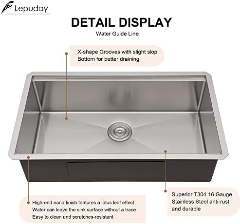 【Easy Draining and The Quietest Sink】 Lepuday 30 inch single bowl undermount kitchen sink with offset drain and gently sloped bottom and X grooves that avoids water from pooling in the sink.Heavy duty sound guard undercoating and softer rubber noise reduction padding to absorb vibration and minimize noise when the stainless steel single bowl kitchen sink is in use.