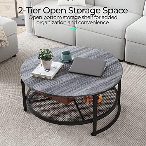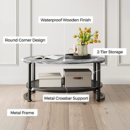 LINSY HOME Round Coffee Table for Living Room, Grey Coffee Table with Open Storage,Wood Surface Top & Sturdy Metal Legs Large Circle Coffee Table for Industrial or Modern Design Home,Gray and Black