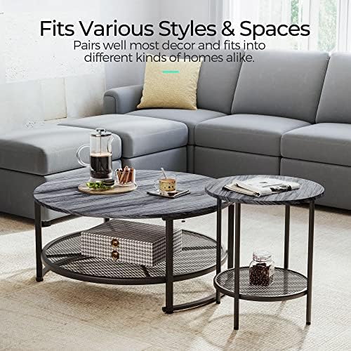LINSY HOME Round Coffee Table for Living Room, Grey Coffee Table with Open Storage,Wood Surface Top & Sturdy Metal Legs Large Circle Coffee Table for Industrial or Modern Design Home,Gray and Black
