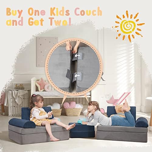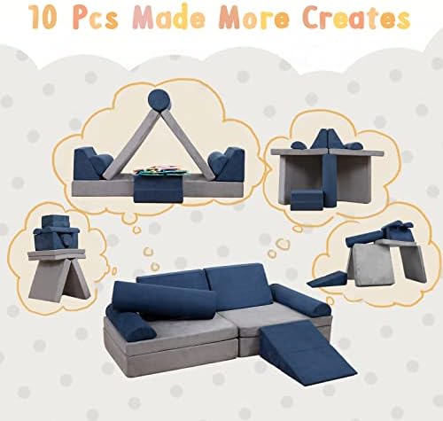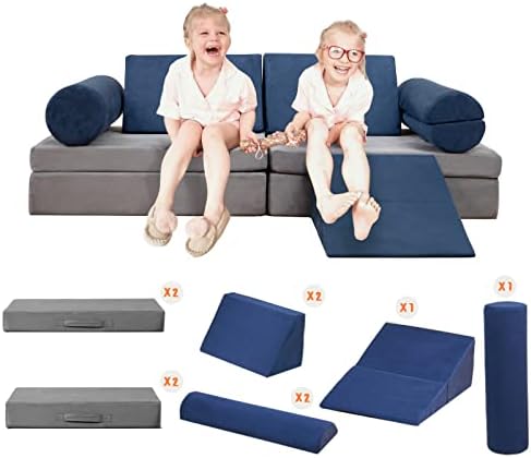 LOAOL 10PCS Imaginative Kids Couch for Playroom, Fun Kids Furniture Floor Couch, Playful & Comfortable Baby Bedroom Couch Play Set for Toddler, Grey & Blue