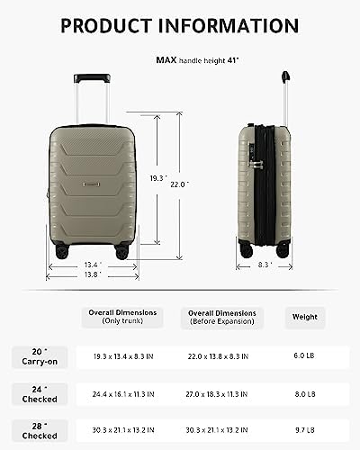 OVERALL DIMENSION -22 x 13.8 x 8.3 IN (Including wheels and handles); DIMENSION AFTER EXPANSION – 22 x 13.8 x 9.5 IN