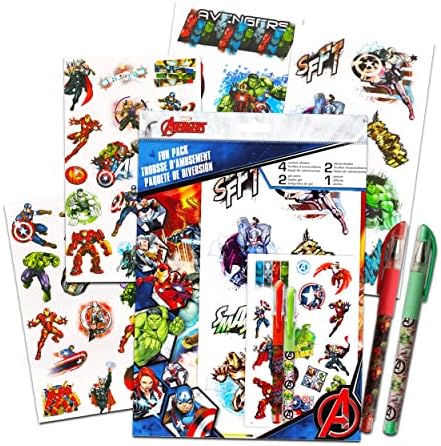 Marvel Avengers Backpack Set – 6 Piece Marvel Superhero School Backpack Bag Set with Snack Box, Pen, Bookmark, Stickers and More (Marvel School Supplies). The deluxe Marvel Kawaii backpack for boys and girls alike is constructed from high quality and durable materials. Features: large 16″ compartment for folders, notebooks, books and other school supplies; adjustable padded straps; large front compartment for pencils, pens and more; top loop for hanging. Measures approximately 16″x12″x4.5″. Manufactured exclusively for Decade West. This 6 piece Marvel school supplies set includes: 1 Marvel Avengers snack box tin; 1 Avengers pen; 1 Avengers mini notebook; 25 Marvel Avengers stickers ; and 1 Avengers bookmark featuring Thanos. Marvel Kawaii fabric features artwork of iconic comic book legends including Iron Man, Spiderman, Captain America, Hulk, Thor, Groot, Daredevil, Falcon, Black Widow, Gamora, Ant Man, Captain Marvel and many more. This officially licensed Marvel superhero backpack set for kids is perfect for back to school, travel, birthday parties and more. A great gift for any fan Marvel Comics and Marvel Legends fan.