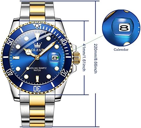 Men’s Watches with Date, Stainless Steel Band, 41mm Unidirectional Rotating Bezel Large Face Case, Quartz Analog Waterproof Luminous Wrist Watch, Two Tone Dress Relojes de Hombre [Green/Black/Blue Dial Watches for Men]