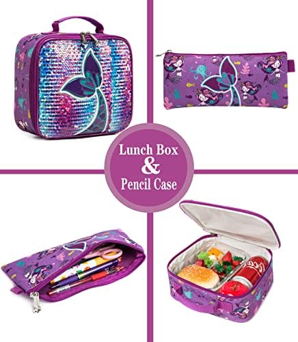 [Kids Backpack Capacity]Mermaid School backpack set including teens rolling backpack,lunch box,pencil case and 1 pendant. Backpack contains 1 large main double zipper compartment with laptop pocket fits for binders; laptops; books; etc.1 front pocket for notepads; glasses; etc.,2 side mesh pocket for water bottles or folding umbrellas;