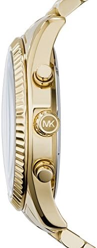Magnificent mastery of style is yours when you wear this illustrious Michael Kors timepiece. Gold-tone stainless steel case and bracelet. Fold-over clasp closure with push-button release. Three-hand analog display with quartz movement, three sub-dials and date display window. Chronograph functionality. Dial face includes stick and Roman numeral hour markers along with brand name. Dial ring features split-second track. Beveled top ring. Water resistant 10 ATM/100 meters.