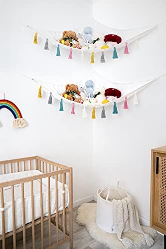 Mkono Stuffed Animal Toys Hammock Boho Hanging Stuff Animals Storage Organizer with Decorative Tassels Corner Large Capability Toy Net Holder for Nursery Playroom Kid's Room Bedroom, 2 Pieces, Large