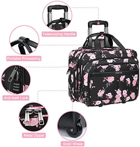 Rolling laptop case is made of peony polyester material, elegant and fashion. The main compartment zipper features an anti-theft design: includes a coded lock and double metal zippers that protect your stuff from thieves and provides a private space. Considerate design with 2 wheels and back trolly belt for easy use during business trip.