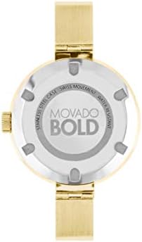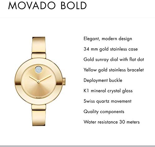 The Movado BOLD women’s watch is inspired by chic architectural purity that lets you discover a sophisticated futuristic vision of our sunray dial. It features a 34 mm yellow gold ion-plated stainless steel case and a ring of highly reflective, yellow gold-toned metallization beneath its edge-to-edge K1 crystal. The yellow gold-toned sunray dial has a clear, crystal-set dot and yellow gold-toned hands and the yellow-gold ion-plated stainless steel bangle-style bracelet includes a secure deployment clasp that makes putting on and taking off your watch as easy as pushing a button. Removable links at the back of the bracelet allow the size to be adjusted to achieve the perfect fit. This elegant and modern wristwatch for women includes all the quality components you expect from Movado. The K1 mineral crystal is more shatter-resistant than sapphire crystal and more scratch-resistant than regular mineral crystal. The Swiss quartz movement ensures the watch is accurate, reliable and requires minimal manual maintenance. The BOLD watch is water resistant up to 30 meters.