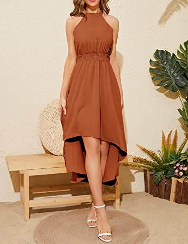 Smocked design at neck and waist, back keyholes with buttons, sleeveless, ruffled and hi-lo hem, stretchy high waist will lengthen your legs, solid color, knee length, elegant summer dresses for women.