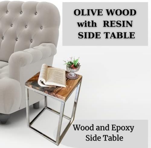 (Luxury Handcrafted Side Table ) Paired with olive wood and epoxy resin a rich natural wooden top this fully handmade airy luxury end table is the perfect accessory to finish off your interior. Add this statement of luxury to your living room and or office and watch your guests admiration build every time they visit.Epoxy resin wood square top has room to hold a table lamp alongside your current book. The live edge coffee table form perfect accent to showcase books, magazines, and other favourite items.