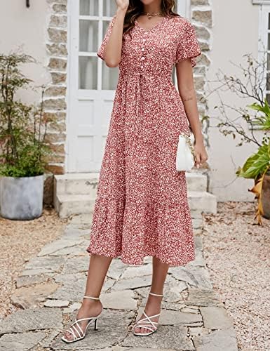 Design:Cute summer dresses for women, v neck, short sleeve, floral print, tiered ruffle hem, modest length. The buttons are decorative. Functional drawstring, is adjustable with the waistband which can be tightened or loosened, making it very figure-friendly.