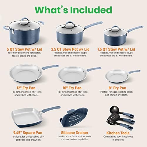 Features: – Professional Home Kitchenware – Basic Kitchen Cookware Set – Multi-Sized Cooking Pots with Lids – Small, Medium & Large Skillet Fry Pans – Durable & Long Lasting Non-Stick Coating – Comfortable Cool-Touch Form-Fitting Handle Grips – Effectively Distributes & Retains Heat for Even Cooking All-Around – See-Through Tempered Glass Lids – Stain-Resistant & Easy-to-Clean – Dishwasher Safe but Not Recommended – Includes Heat-Resistant Kitchen Tool Utensils – Silicone Strainer – Bakeware Set – Food-Grade Safe, Environmentally Friendly Construction – Pots & Pans Safe for Gas, Electric, Ceramic & Induction Counter Cooktops – PFOA and PFOS Free What’s In The Box: – Sauce Pot with Lid, 1.5QT – Sauce Pot with Lid, 2.5QT – Dutch Oven Pot with Lid, 5QT – Small Fry Pan, 8-Inch – Medium Fry Pan, 10-Inch – Large Fry Pan, 12-Inch – Soup Ladle – Pasta Fork – Spatula – Silicone Strainer – Muffin Pan – Loaf Pan – Round Pan – Square Pan – Roast Pan – Baking Tin Technical Specs: – Max Temperature: 400° Fahrenheit (200° Celsius) – Construction Material: Reinforced Pressed Aluminum Metal, Engineered Nylon Silicone, Tempered Glass, Strainer Silicone – Coating Thickness: 18-25 um, 2.5mm Multi-Layered Cookware – Material Metal Hardness:1-2 HB (How many HB?) – Sauce Pot Size (L x W x H): 13’’ x 6.30’’ x 3.15’’ -inches (with Lid) – Sauce Pot Size (L x W x H): 14.76’’ x 7.08’’ x 3.54’’ – inches (with Lid) – Dutch Oven Pot Size (L x W x H): 13.77’’ x 9.45’’ x 4.72’’ – inches (with Lid) – Small Fry Pan Size (L x W x H): 15.15’’ x 7.9’’ x 1.57’’ -inches (with Handle) – Medium Fry Pan Size (L x W x H): 18.5’’ x 10.24’’ x 1.88’’ -inches (with Handle) – Large Fry Pan Size (L x W x H): 20’’ x 11.81’’ x 1.96’’ -inches (with Handle) – Square Pan Size (L x W x H): 17.52’’ x 9.45’’ x 1.73’’ -inches (with Handle) – Muffin Pan Size (L x W x H): 15.35’’ x 11.02’’ x 1.57’’ -inches – Loaf Pan Size (L x W x H): 9.09’’ x 5.04’’ x 2.72’’ -inches – Round Pan Size (L x W x H): 7.67’’ x 7.67’’ x 1.77’’ -inches – Square Pan Size (L x W x H): 8.54’’ x 8.54’’ x 1.97’’ -inches – Roast Pan Size (L x W x H): 13.38’’ x 9.64’’ x 2.16’’ -inches – Baking Tin Size (L x W x H): 13.38’’ x 9.64’’ x 1.38’’ -inches.