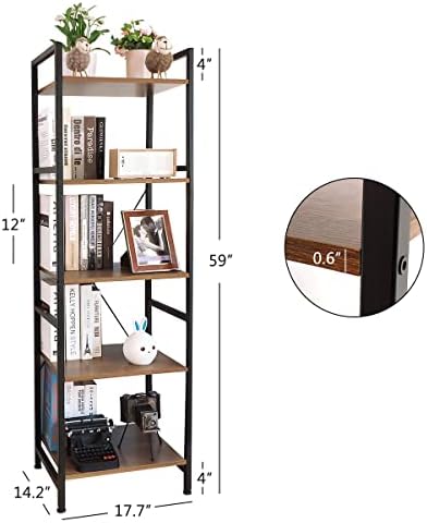 ❀Size:17.7″ x 14.2″ x 59″ ❀Color: black/brown ❀Material: The frame is made of iron, which is strong and not easily deformed. ❀This classic modern bookshelf features 5 tiers, providing plenty of storage space to display rows of your favorite reads, clusters of collected curios, and lines of family photos. A favorite piece that combines decorative and functional purposes together, suitable for any places from the bedroom to the living room.