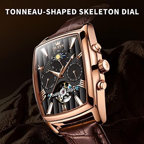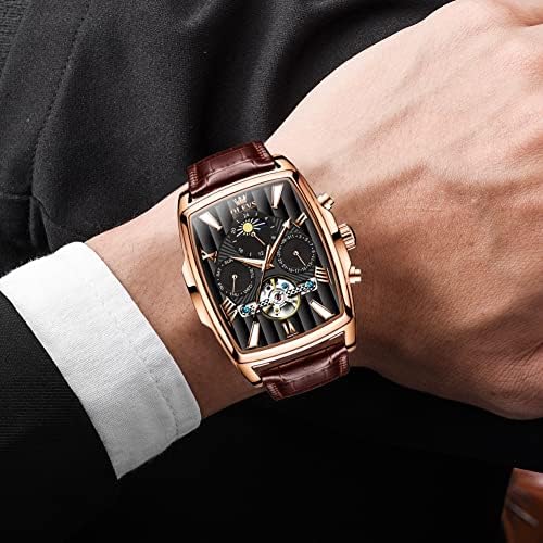 Introducing the OLEVS men’s square automatic mechanical watch – a perfect blend of retro style and modern functionality. The self-winding mechanism ensures hassle-free use, while the hollow design and leather strap add a touch of sophistication. This 98-feet waterproof timepiece features a day-date sub-dial and sun moon display sub-dial, luxurious and practical. With Roman numerals completing the look, this watch is suitable for all dress codes, making it an excellent addition to your collection.