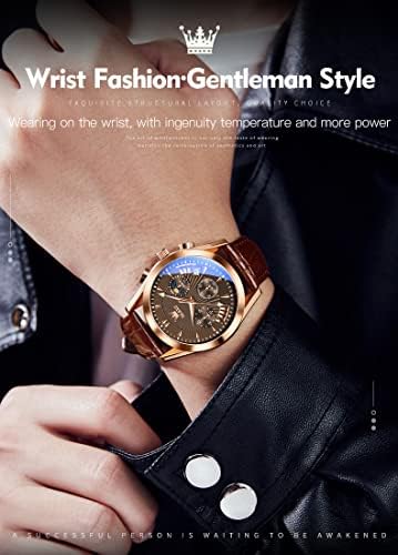 HOW men’s wrist watchesWORKS High quality original quartz movement mens watch, 4~5 o’clock is calendar window, the sub dial in the north direction is 1/ 10 second subdial, the sub dial in the south direction is 60 second chronograph, the sub dial in the west is 60 minute chronograph—–chronograph watches for men. 3 sub-dials provide precise time keeping. High hardness scratch resistant coated glass mirror. Luminous pointer is convenient for you to read in the dark. Gold case and soft, skin-friendly leather strap bring you a comfortable wearing experience.It is a best choice for those who loves leather watch. Mens sport watches:Suitable For Outdoor Sports Such As Running, Sports, Fishing, Dating, New Year, Christmas, Thanksgiving, Hollywood, Wedding, Anniversary, Birthday, Graduation Ceremony, Father’s Day, Birthday Party, Wedding, Business Activities, Gifts, Souvenir. ✲Watch with Gift Box✲—reloj para hombre Detailed information of mens watch Movement: Japanese quartz movement men watches Button type: pin buckle type Case material: Alloy Material: Leather belt Watch: Durable Coated Glasses Battery: Sony battery Waterproof: 3ATM Case Diameter: 1.57 inches /40 mm Case Thickness: 0.47 inches / 12mm Band Width: 0.78 inches / 20 mm Strap Length: 8.66inches / 22 cm Weight: Leather 1.94 oz / 55 g Use tips of dress watches for men luminous mens watch,easy read men watch (when using the night light function for the first time, illuminate the watch for 30 seconds under the light to activate the light function).waterproof leather watch(30m),support hand washing, rain, sailing and water sports swimming and bath in cold water, ✘ don’t press any buttons underwater,not suitable for deep diving✘