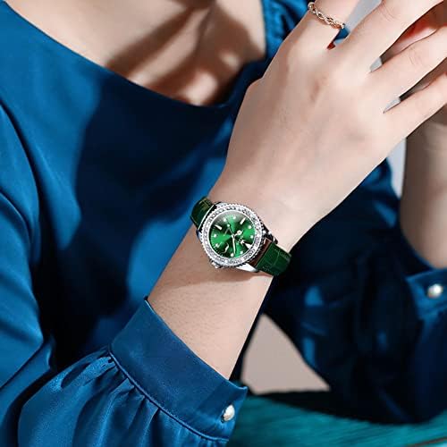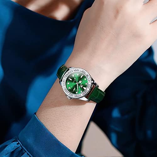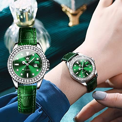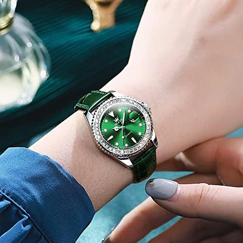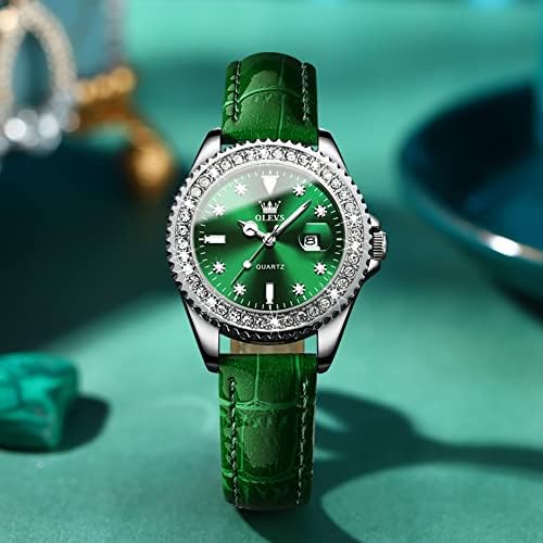 OLEVS Watches for Women Diamond with Date Luxury Leather Female Waterproof Women Wrist Watch Analog Dress Stainless Steel Ladies Watch Luminous Calendar Women Watch Green/Silver/Red Dial