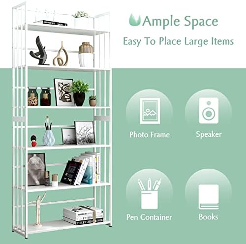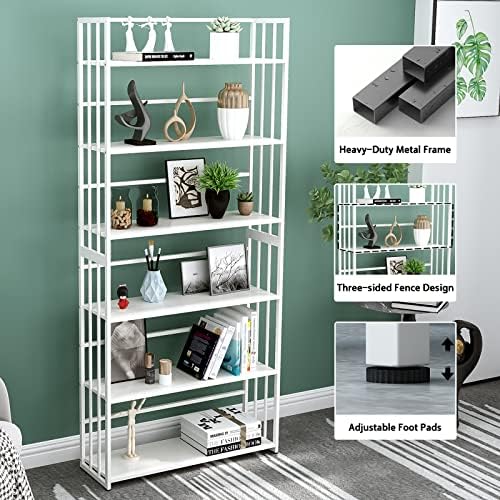 OSCHF 6-Tier Open Shelf Bookcase – Modern Display Bookshelf with Three-Sided Fence and Metal Frame for Home and Office, Freestanding Shelf, White
