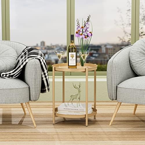 OVICAR Gold Side Table – 2 Tier Metal Round End Table Coffee Table Small Sofa Side Table Outdoor Indoor Accent Table Nightstand Waterproof Removable Tray Table for Living Room Bedroom Balcony