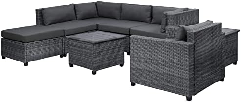 Turn your backyard into an outdoor getaway with our 8-Piece Wicker Patio Set. Designed with versatility in mind, each set comes with a 2 seater sofa, lounge sofa, coffee table and side sofa chair. Instantly create a cohesive sectional by simply pushing the 2 seater sofa and lounge sofa together, or separate them if you want your patio set to cover a larger area of space. Crafted with thick woven rattan wicker weaving reinforced with rust resistant steel, this patio set is resistant to water, cracking, splitting and sun rays so it can last you and your family for years to come. Lean back and relax for hours on end with the thick high density foam cushions upholstered in soft fabric covers that are formulated for easy spot cleaning, while the spacious design comfortably sits 5-6 people for plenty of room for your family and guests. This patio set is the perfect addition to backyards, patios, poolside, gardens and any other outdoor spot that needs a little polishing up.