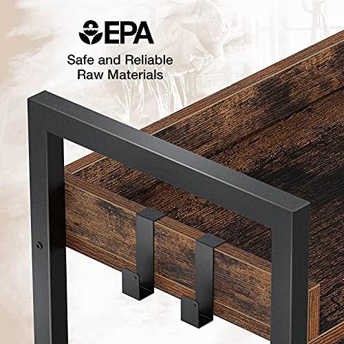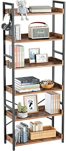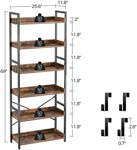 Rolanstar Bookshelf 6 Tier with 4 Hooks, Industrial Wood Bookcase, Vintage Storage Rack with Open Shelves, Rustic Standing Bookshelves Metal Frame Display Rack for Living Room, Bedroom, Rustic Brown