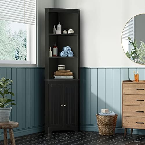 【Large Storage Corner Cabinet】 This corner shelf with a diamond curved design is great to make the most use of your space. The upper half of the corner shelf has 3 tier of open storage to hold books, framed photos, decorative items, and more. At the bottom of the corner cabinet is a double tier storage cabinet with a magnetic door for more concealed storage. Sure to be a perfect addition to your living room, bedroom or patio to add a classic style.