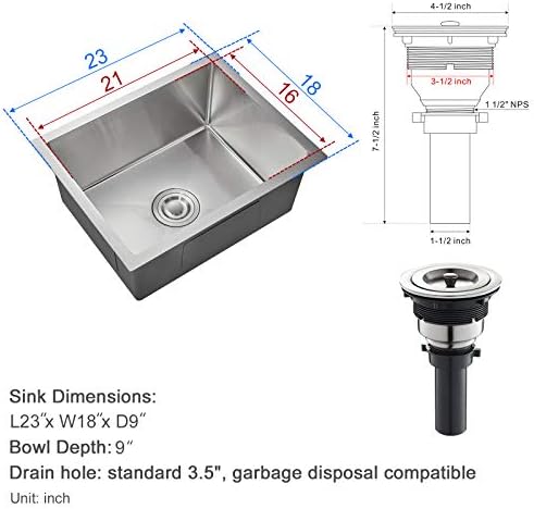 Sink Dimensions: 23x18x9″; Bowl Size: 21×16″; Drain Opening Size: 3 1/2″