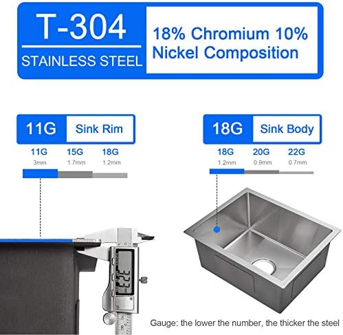 【304 Stainless Steel Sink】Handmade 304 stainless steel sink, 11 Gauge sink lip with 18 Gauge basin is durable and anti-rust; Brushed finish is easy to clean, long-lasting and matches well with your kitchen appliances