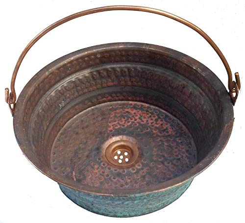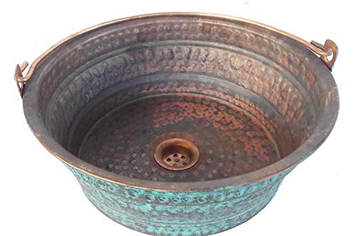 Size: 13X13X5 inches. Shown drain cover is not included. Imperfections to be expected due to hand making. Our Egyptian hand makers use raw virgin copper and old world simple primitive tools to handcraft copper sinks. Unlike copper sinks in other parts of the world made from recycled scrap copper. Our hand made sinks draws inspirations from our buyers, antique dealers, decorators, shop owners, artists, contractors, interior designers, architects, builders and collectors. We custom make sizes, shapes, textures and finishes per request. Copper has the best combined properties of any other metals as it is durable, recyclable, earth friendly, natural and reusable. Copper has been used for buildings, bridges, weapons, decorative jewelry and hand tools for long time through history. Copper is highly sensitive to heat conduction, spreads heat evenly and saves energy. Copper cookware comes in original bare surface or tin lined based on type of the food. Copper reacts with various elements through time. Natural copper oxidation will add beauty to any decor. Enamel clear wax will help to minimize the oxidation process. Copper maintenance includes avoiding water spots and using soft cloth and regular water to clean copper surface. Our copper bathroom sinks products are lead and mercury free, eco-friendly and green solution to implement the practices that will lead to healthier living for the planet and our future generations. Maintenance of copper sinks is simple by using soft cloth, regular soap water and wax.