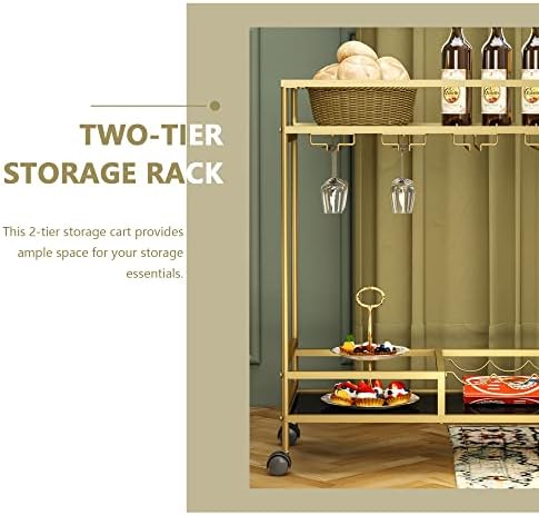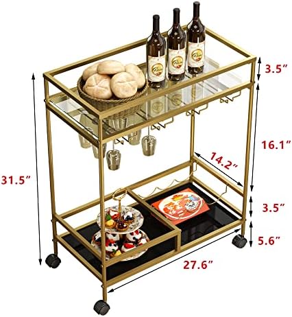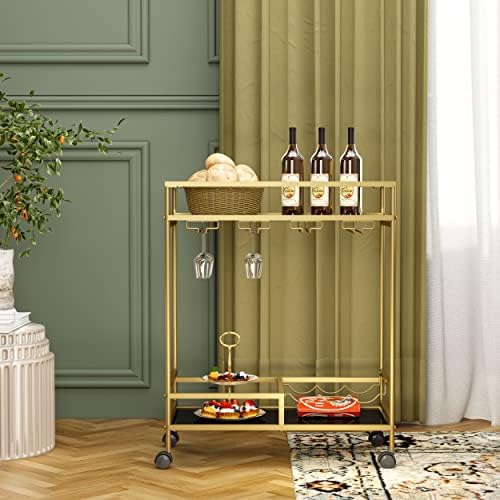 RYR 2 Tier Bar Cart Gold,Kitchen Serving Cart for Home with Wheels,Wine Cart with 2 Mirrored Shelves,Wine Holders,Glass Holder,Storage Shelves for Kitchen,Living Room,Dining Room
