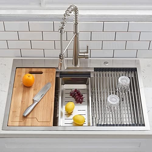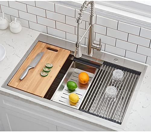 Quiet Drop In Kitchen Sink: Simple installation, suitable for all countertop. Extra thick rubber dampening Pads & stone guard undercoating, assuring exceptional noise reduction and quiet dependability