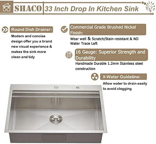 SHACO 33×22 Inch Drop In Kitchen Sink, 33 Inch Stainless Steel Top Mount Kitchen Sink, Single Bowl Overmount Double Ledges Workstation Sink with Accessories, Brushed Nickel