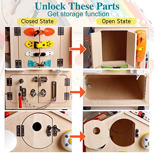Exquisite design: Compared with other busy planks, activity cubes or busy boxes, this well-designed busy house is more attractive to children of all ages. The main design of the house makes children like this activity center more. There are four movable wheels with locks, you can easily move and lock it, and there is a large storage room that can hold books and toys.