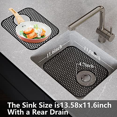 Sink Protectors for Kitchen Sink – YUBIRD 13.58"x 11.6" Sink Mats, 2 PCS Silicone Kitchen Sink Mat for Bottom of Stainless Steel Sink(Black, Rear Drain)