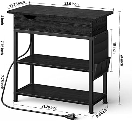 SJIE End Table with Charging Station, Bedside Table/Nightstand,Narrow Flip Top Side Table with USB Ports and Outlets for Living Room,Bedroom and Small Spaces (1, Black)