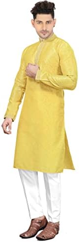 STYLISH AND ELEGANT: Striking 2 Kurta Pajama set, includes a top (Tunic / Kurta) and drawstring waist trousers (pajama). Brocade material and ivory thread embroidery adds elegance and sophisticaton. A hip and timeless kurta pajama; long knee length tunic, with a mandarin collar and long sleeves that is flattering in every size. QUALITY MATERIAL: Lightweight and breathable dupion art raw silk fabric gives this kurta pajama set an elegant look and soft, comfortable feel. SIZING & GARMENT CARE: The kurta is designed for a regular relaxed fit, in knee length with vented sides and 2 innovative side pockets. Please refer to the size chart (included in the image section) for further details. Dry clean only. Low iron if necessary. PERFECT GIFT: A unique and versatile gift that can be enjoyed at weddings, parties, festivals and carnivals. Give this kurta pajama set as a thoughtful present for Birthdays, Christmas, Father’s Day, Eid, Diwali, Bollywood parties and many other celebrations. ALSO KNOWN AS: Men’s Salwar Kurta, Men’s Kurta, Kurta Pajama, Kurta Pathani, Kurta Tunic Pajama Set, Traditional Menswear, Sherwani, Wedding Kurta Pyjama and Bollywood Fancy Dress Costume.