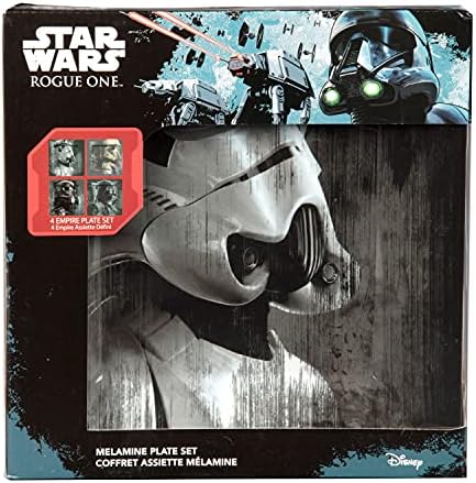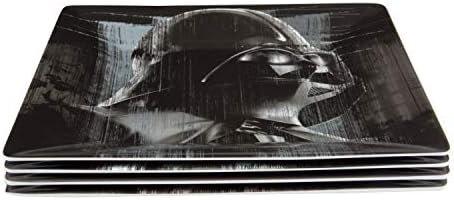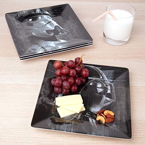 Eat your dinner on the Dark Side with this Star Wars Empire Villain themed plate set! Plates feature four unique Imperial characters, all with a distressed design. Characters include Darth Vader, Death Trooper, Stormtrooper and Shoretrooper. Durable melamine is great for kids! The plate set is also dishwasher safe for easy food clean up! Makes a perfect gift for boys and girls who love the Star Wars movies! Also great for Star Wars themed birthday parties! Officially licensed Star Wars merchandise. Includes 4 plates. Measure: 8 x 8 inches each. Dishwasher safe. Do not microwave.