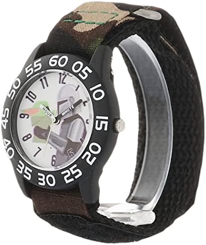 Disney Star Wars Mandalorian,The,Child,The Boys’Black Plastic Time Teacher Watch. 32mm Plastic case, 16mm Camo Nylon Strap, dial features Star Wars. Mineral glass crystal, stainless steel case back, Japan quartz movement, water resistance to 100 feet.