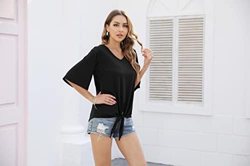 SUEANI Women’s Tie Front Tops Summer V Neck 3/4 Bell Sleeve Twist Knot Shirt