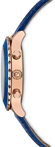 A blue, faceted crystal ring adorns the bezel, complementing the rose-gold tone PVD coated case and index markers