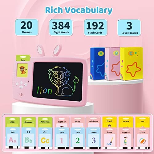 🔊FUN TO LEARN WORDS: Included bulk vocabulary words recourse with standard Amercian pronunciation, 384 sight words, 192 double-sided flash cards, 20 themes (Numbers, Letters, Colors, Shapes, Foods, Vegetables, Orientations, Locations, Countries…)from basic words to high grade words to meet different ages kids 3-6. Animals, transplantation and musical instruments words card with vivid lifelike sounds. Great speech therapy toys to encourage kids autism to read and enhance memory recognition.