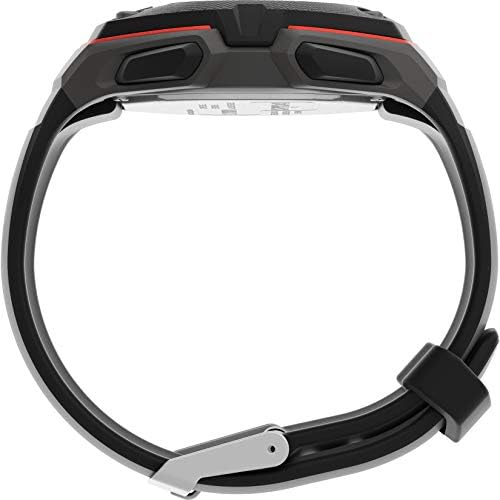 Dark gray & black 43mm resin case with acrylic lens; red accents; gray digital display; Indiglo light-up watch dial