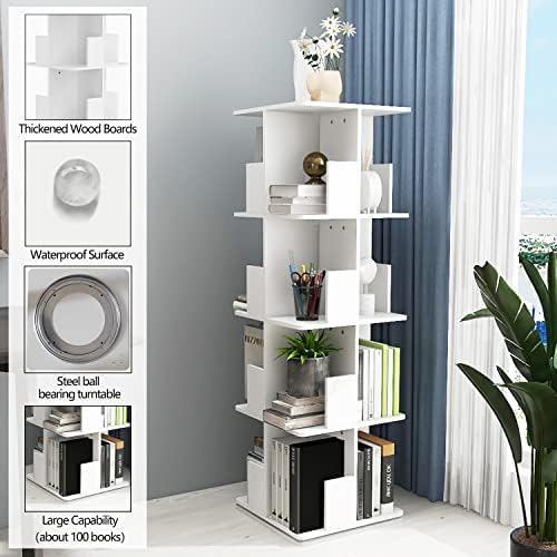 Tohomeor Rotating Bookshelf 4 Tier Bookcase Square Floor Standing 360° View Stackable Storage Display Book Rack Wooden Shelf for Living Room Nursury Bedroom Study Office Corner Space (White)