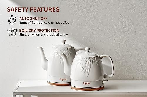 Toptier Electric Ceramic Tea Kettle, Boil Water Quickly and Easily, Detachable Swivel Base & Boil Dry Protection, Carefree Auto Shut Off, 1.5 L, White